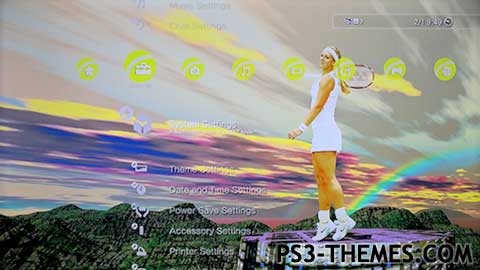 A theme featuring german tennis player Sabine Lisicki. The theme includes ten HD (1920×1080) wallpapers and customized main menu XMB icons. All backgrounds, textures and colour effects used are made by me.